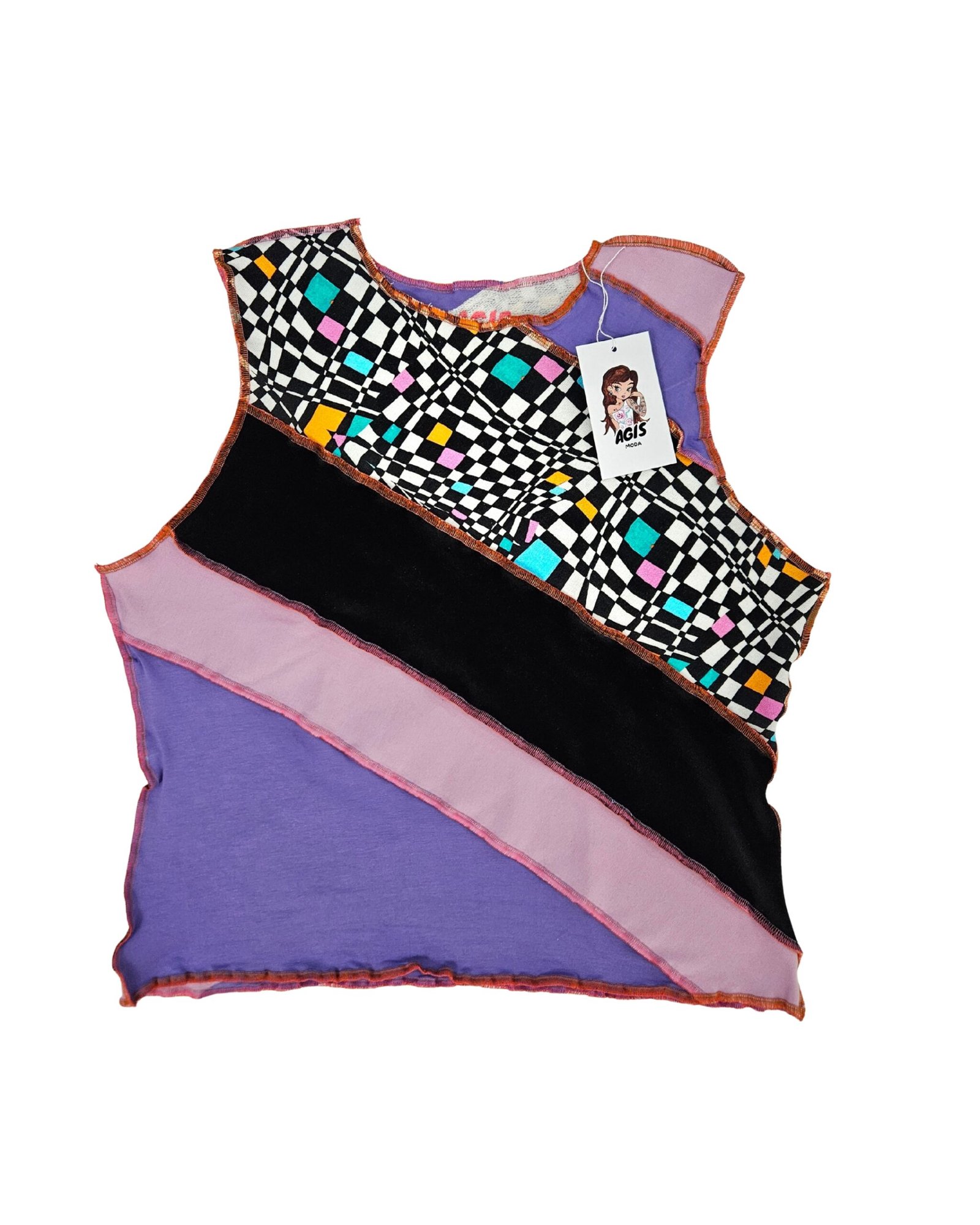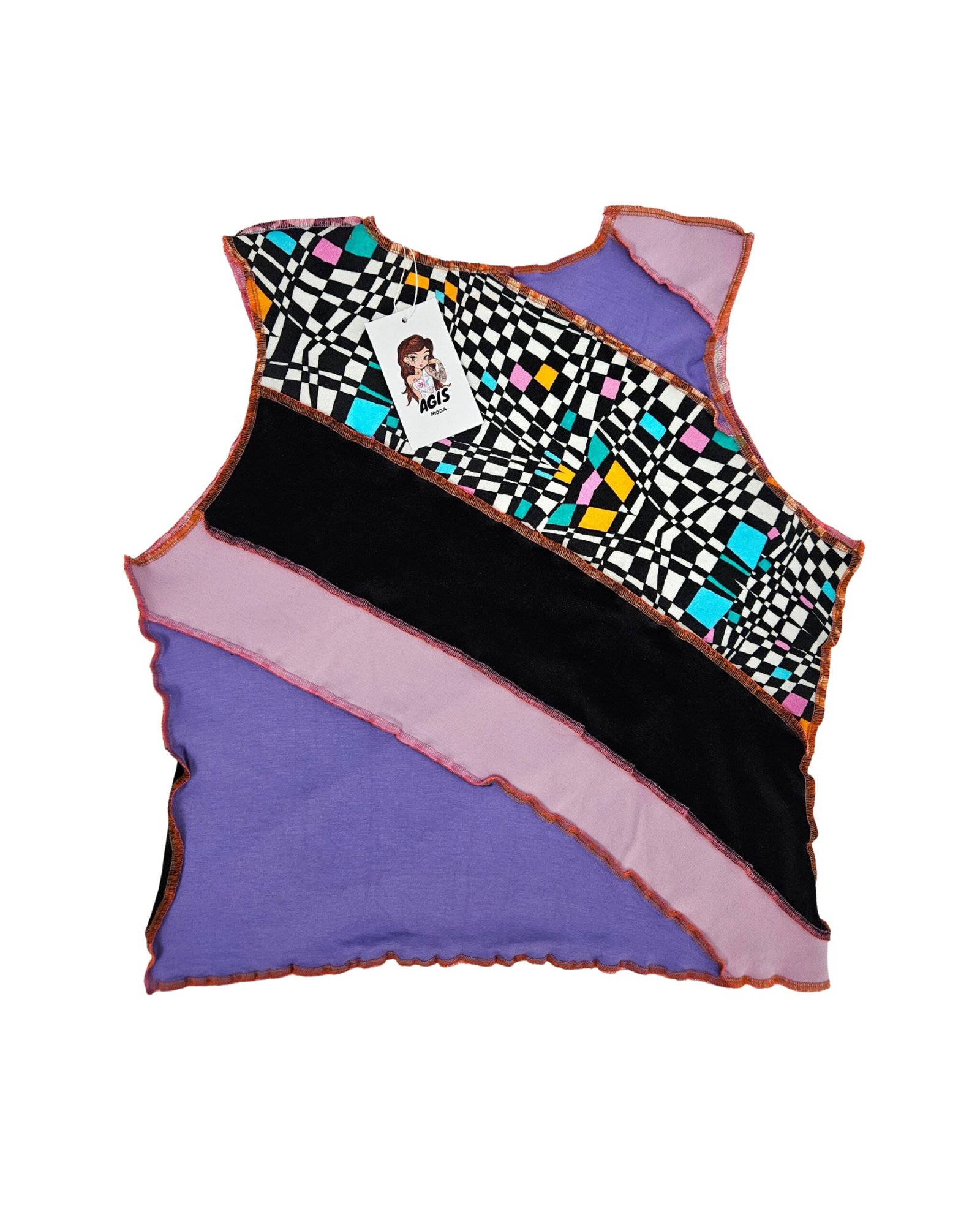 Regata retalhos quadriculada preta e colorida (G)Regata retalhos quadriculada preta e colorida (G)